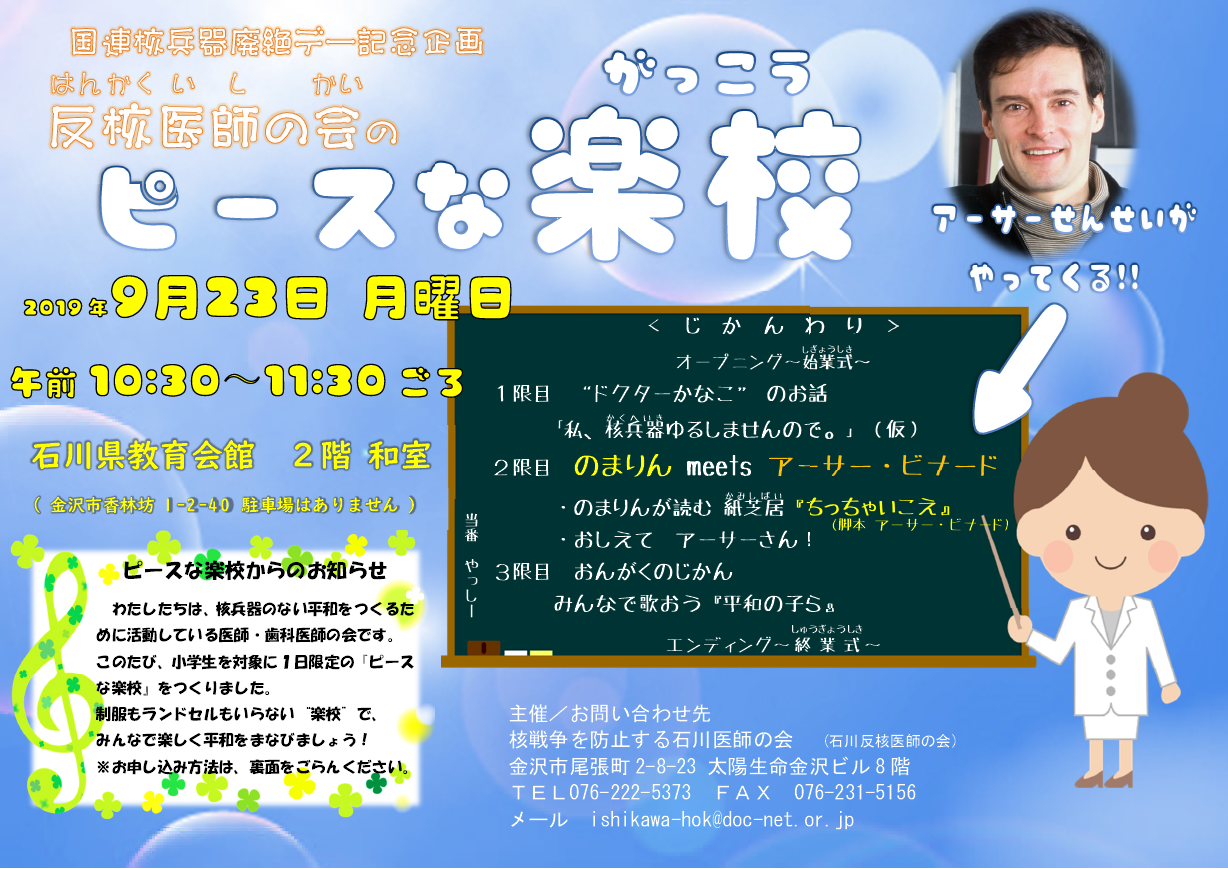 石川反核医師の会では、毎年、国連核兵器廃絶デー(9 月26 日)を記念するイベントを開催していますが、今年(2019年)は9月23日に、アメリカ生まれの詩人アーサー・ビナードさんをお迎えし、石川県教育会館にて開催しました。