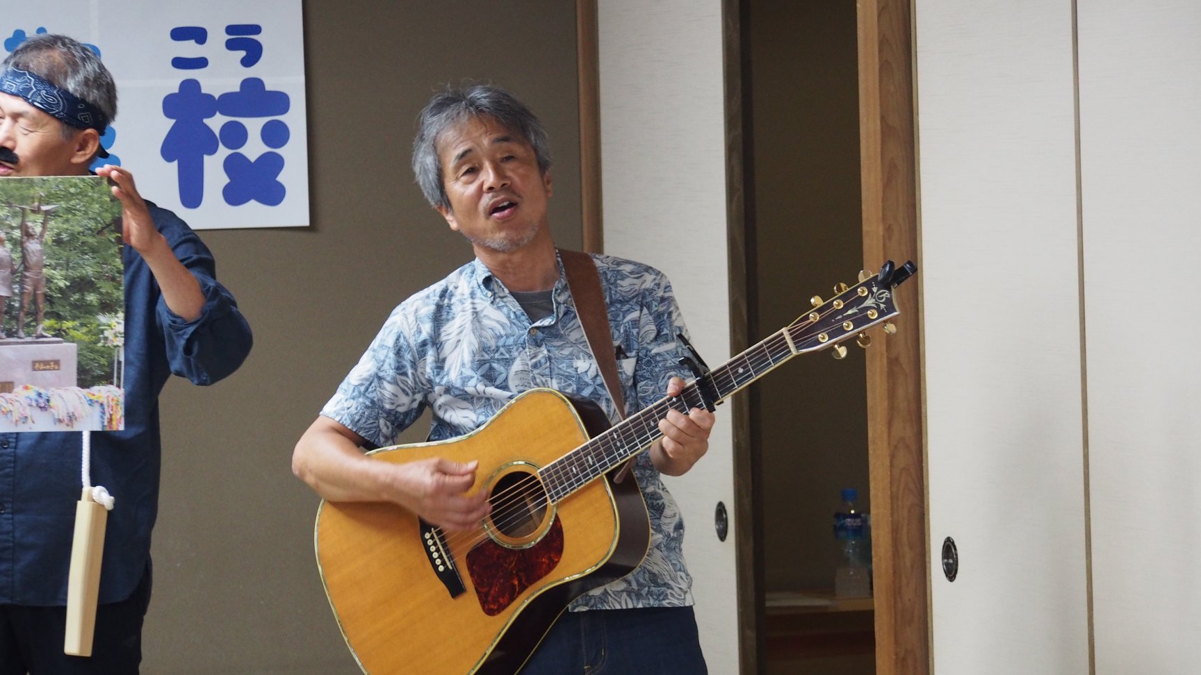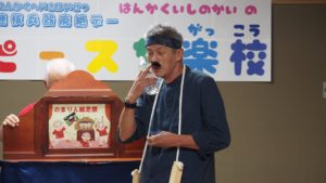 2時間目は、のまりんmeetsアーサー・ビナード①のまりんが読む紙芝居「ちっちゃいこえ」②おしえてアーサーさん~アーサーさんから紙芝居制作の経緯や思いを聞く~