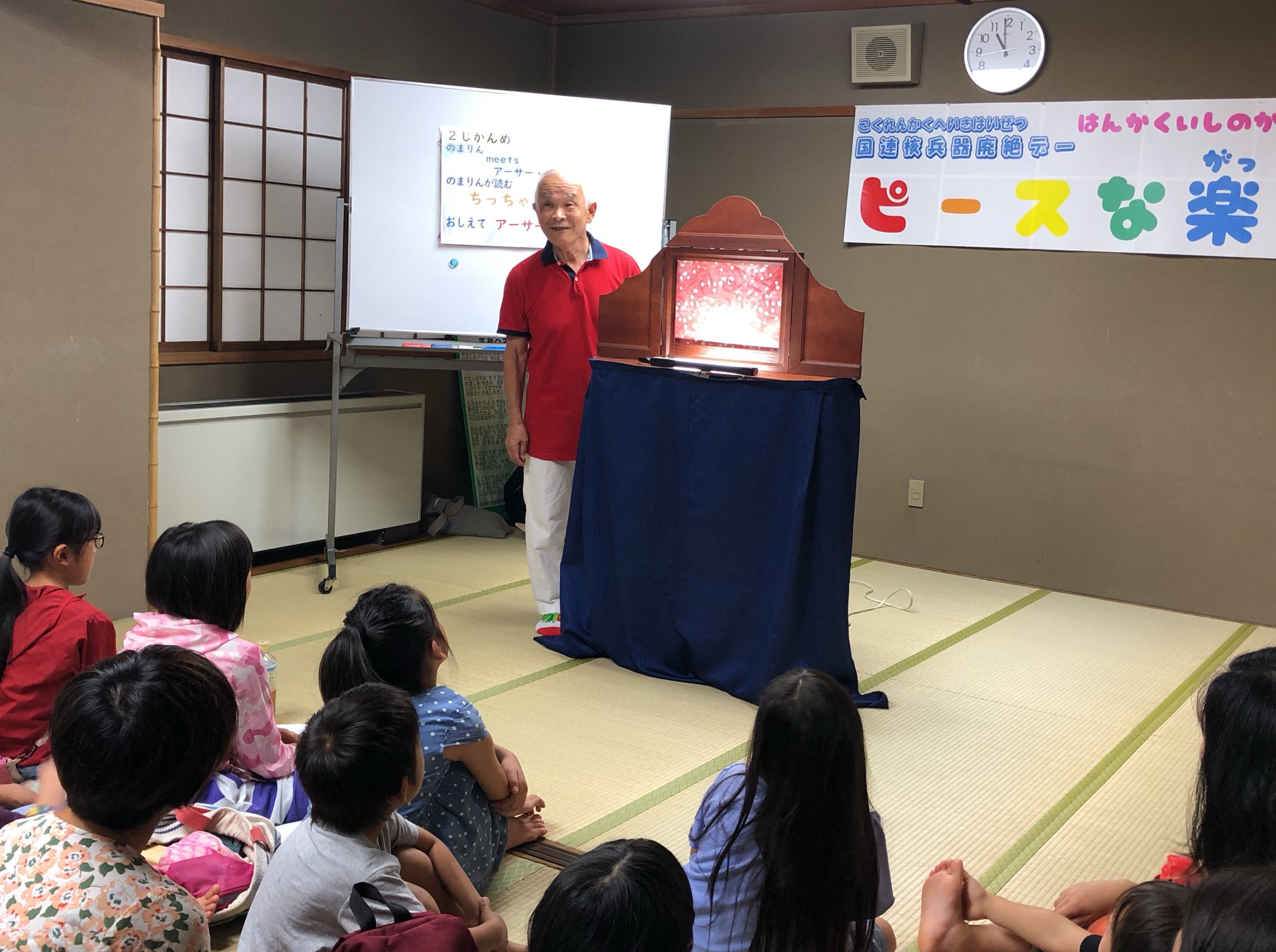 当日は、午前の小学生向け企画「ピースな楽校」、午後の大人向け企画「アーサー・ビナード講演会」合わせて370人以上の方に来場いただき、紙芝居「ちっちゃいこえ」の上演やアーサーさんのトークを通して、核をめぐる問題の本質を学び、核兵器の廃絶のために一人ひとりができることを考えました。