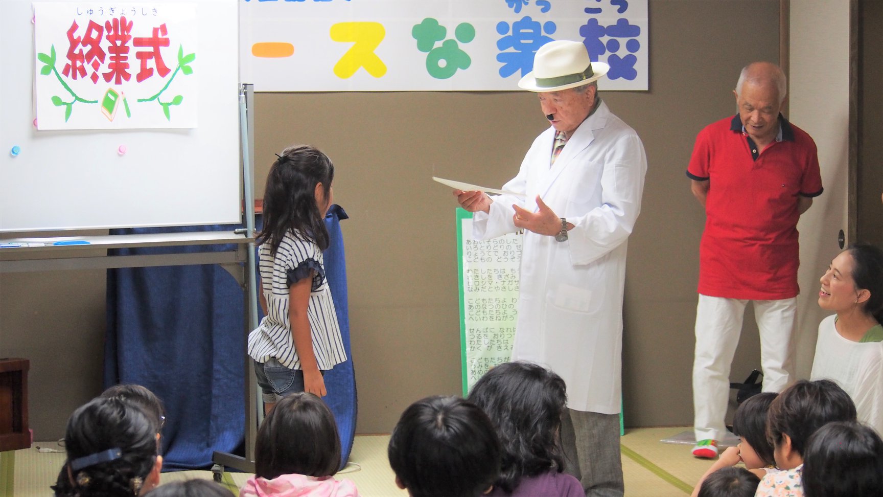 終業式では、校長先生から一人ひとりに「修了証書」と「石川反核医師の会のバッジ」を手渡しました。 - 「核兵器って何?」「核兵器が使われると生きものの命はどうなるの?」「私たちはどうしたら生きていけるの?」等について、一人ひとりが学び考える時間となった「ピースな楽校」。随所に「ヤッシー・タイム」の楽しいコントが入り、最後は被爆者の願いが込められた歌「平和の子ら」を皆で合唱するなど、子どもたちが楽しめるよう工夫を凝らした内容となりました。
