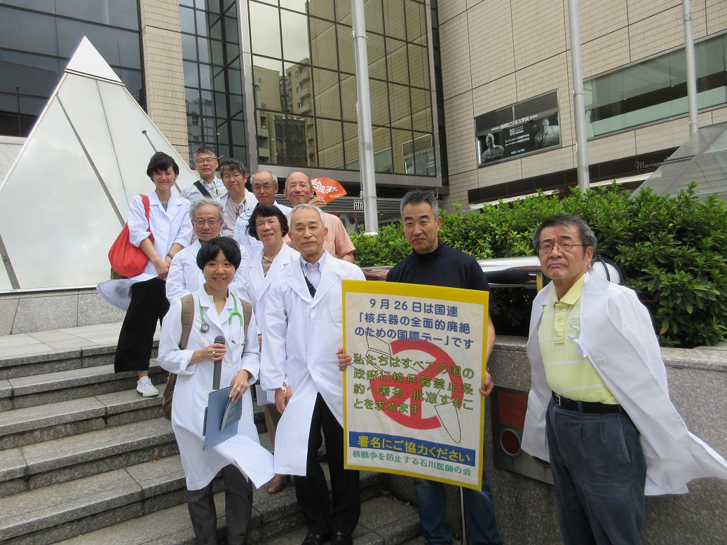 ヒバクシャ国際署名の協力を呼び掛ける街頭宣伝を今年も実施しました。参加は11人。当初は30分間の予定でしたが、台風による雨風のため、時間を短縮しての開催となりましたが、講演会とあわせて19筆の署名にご協力いただきました。
