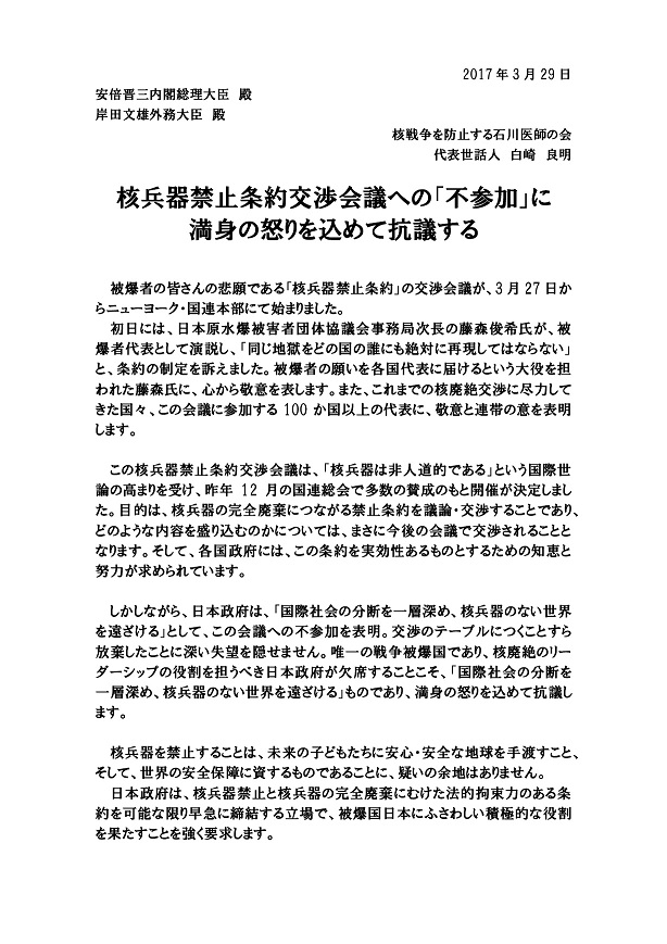 石川反核医師の会は、3月29日、「核兵器禁止条約交渉会議への『不参加』に満身の怒りを込めて抗議する」を安倍晋三首相と岸田文雄外相宛てに送りました。抗議文は以下をご覧ください。