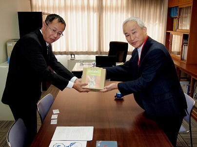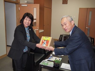 次に訪問したのは、正面には鳥越城址、校庭からは白山をのぞむ鳥越小学校です。この豊かな環境で、先生と生徒さんがのびのびと生活しているのが印象的でした。校舎に入って早々「神田さ~ん!」と、同行した神田順一さん(非核の政府を求める石川の会事務局長、核戦争を防止する石川医師の会事務局)を呼ぶのは、今年で結成20周年を迎えた「でえげっさあ」の川崎正美先生。松田真由美校長、司書の吉田晴子先生にも同席いただき、和やかに懇談が進みました。