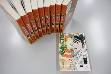 司書の吉田先生がおっしゃるには、戦争の恐ろしさが伝わりやすいと思われる写真集等は、小学生にとってはその意味するところが理解できず、ふざけて見てしまう子も多いそうです。一方、『はだしのゲン』をふざけて読む子は一人もいなかったと言います。『ゲン』にはストーリーがあり、辛い思いをしながらも仲間と助け合って生きていく姿に、子どもたちは惹かれるのではないかとおっしゃっていました。
