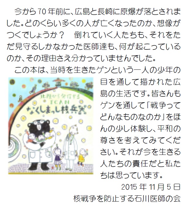 来月19日は、『はだしのゲン』の作者・中沢啓治さんの3年目の命日にあたります。中沢さんが亡くなられてから、この間、松江市教育委員会による小中学校の閲覧制限、秘密保護法や安保法制の成立、石川県内では育鵬社の歴史教科書が採択されるなど、中沢さんの遺志に逆行するような流れが次々と生まれていることが残念でなりません。それでも、子どもたちの心に平和の種を撒く「ゲンの寄贈運動」は、数年後、数十年後に花開くことを信じて、地道にコツコツと続けていきたいと思っています。